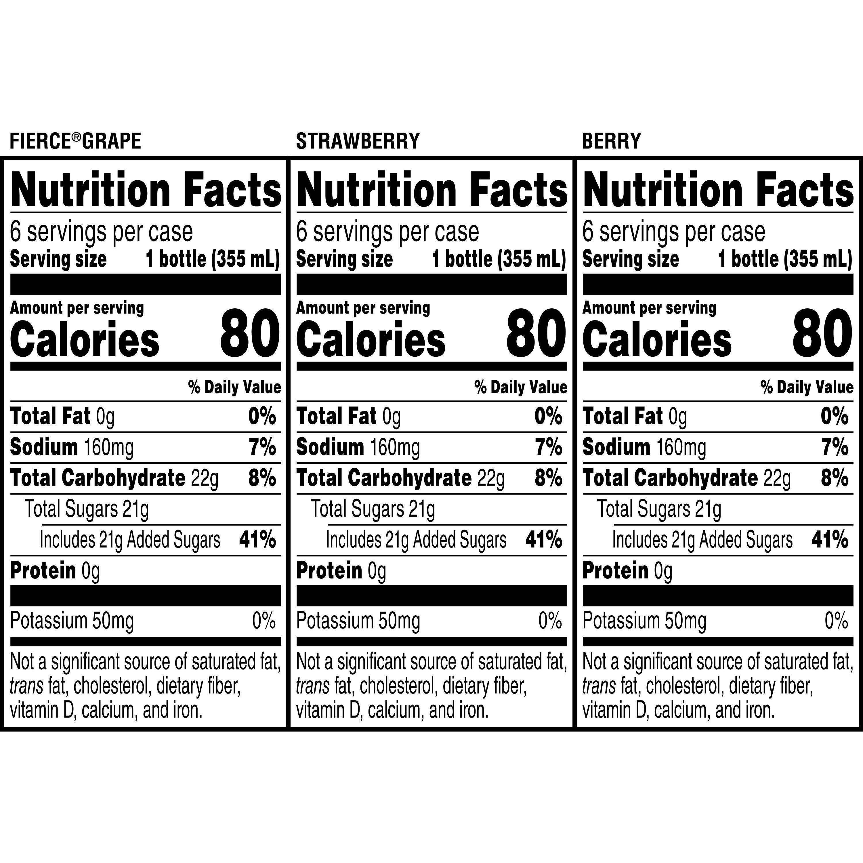 Gatorade Fierce Grape: Water, Sugar, Dextrose, Citric Acid, Natural And Artificial Flavor, Salt, Sodium Citrate, Monopotassium Phosphate, Modified Food Starch, Glycerol Ester Of Rosin, Blue 1, Red 40.