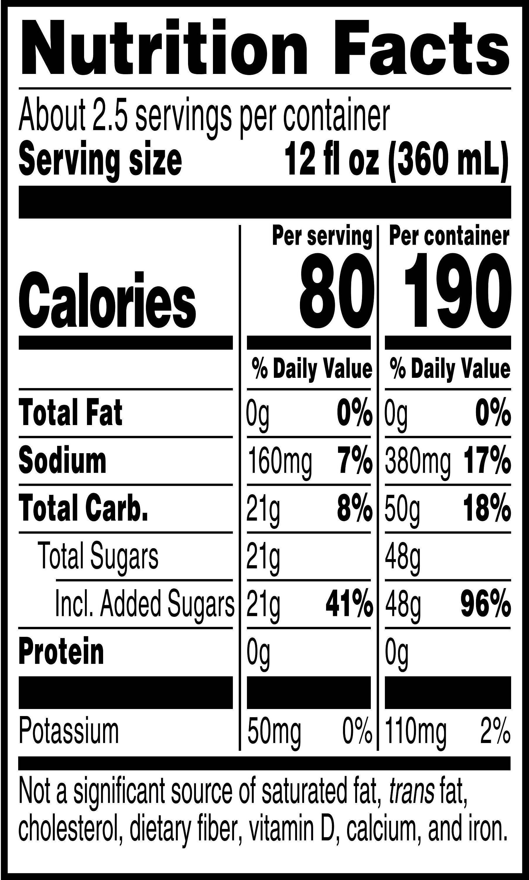 Ingredients: Water, sugar, dextrose, citric acid, natural and artificial flavor, salt, sodium citrate, monopotassium phosphate, modified food starch, glycerol ester of rosin.