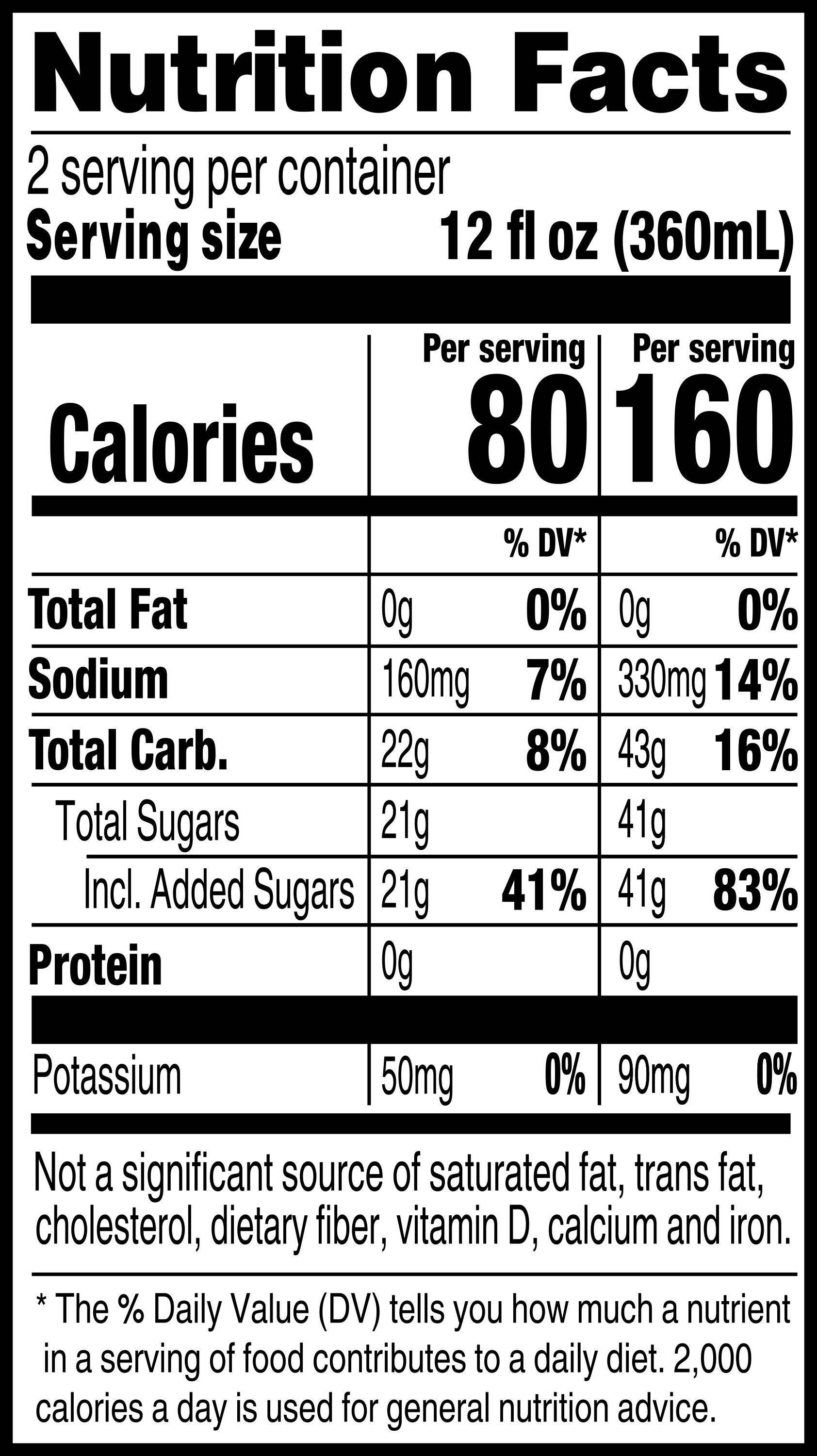 Ingredients: Water, sugar, dextrose, citric acid, salt, sodium citrate, monopotassium phosphate, gum arabic, glycerol ester of rosin, natural flavor, yellow 5.