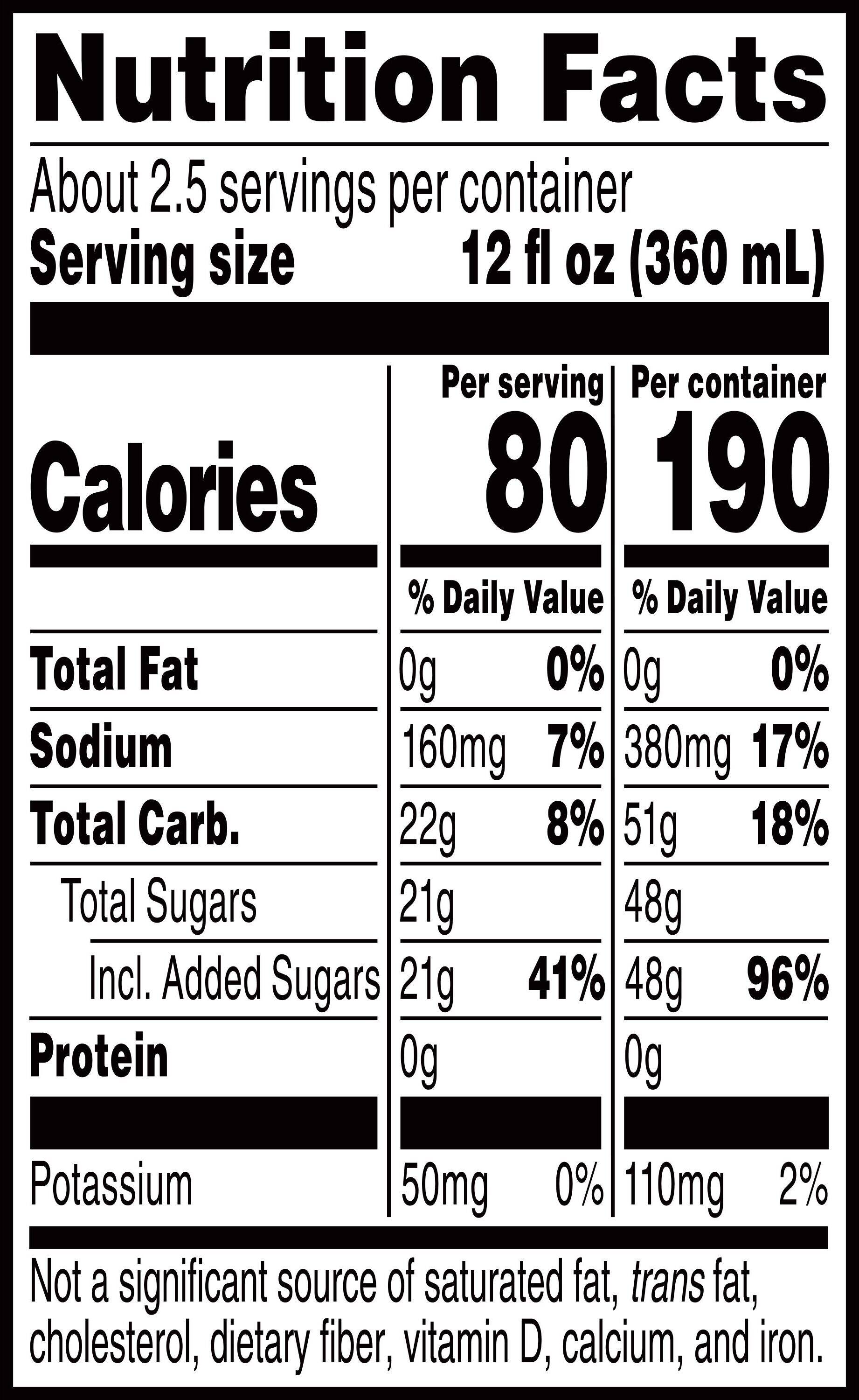 Ingredients: Water, sugar, dextrose, citric acid, salt, sodium citrate, monopotassium phosphate, gum arabic, glycerol ester of rosin, natural flavor, yellow 5.