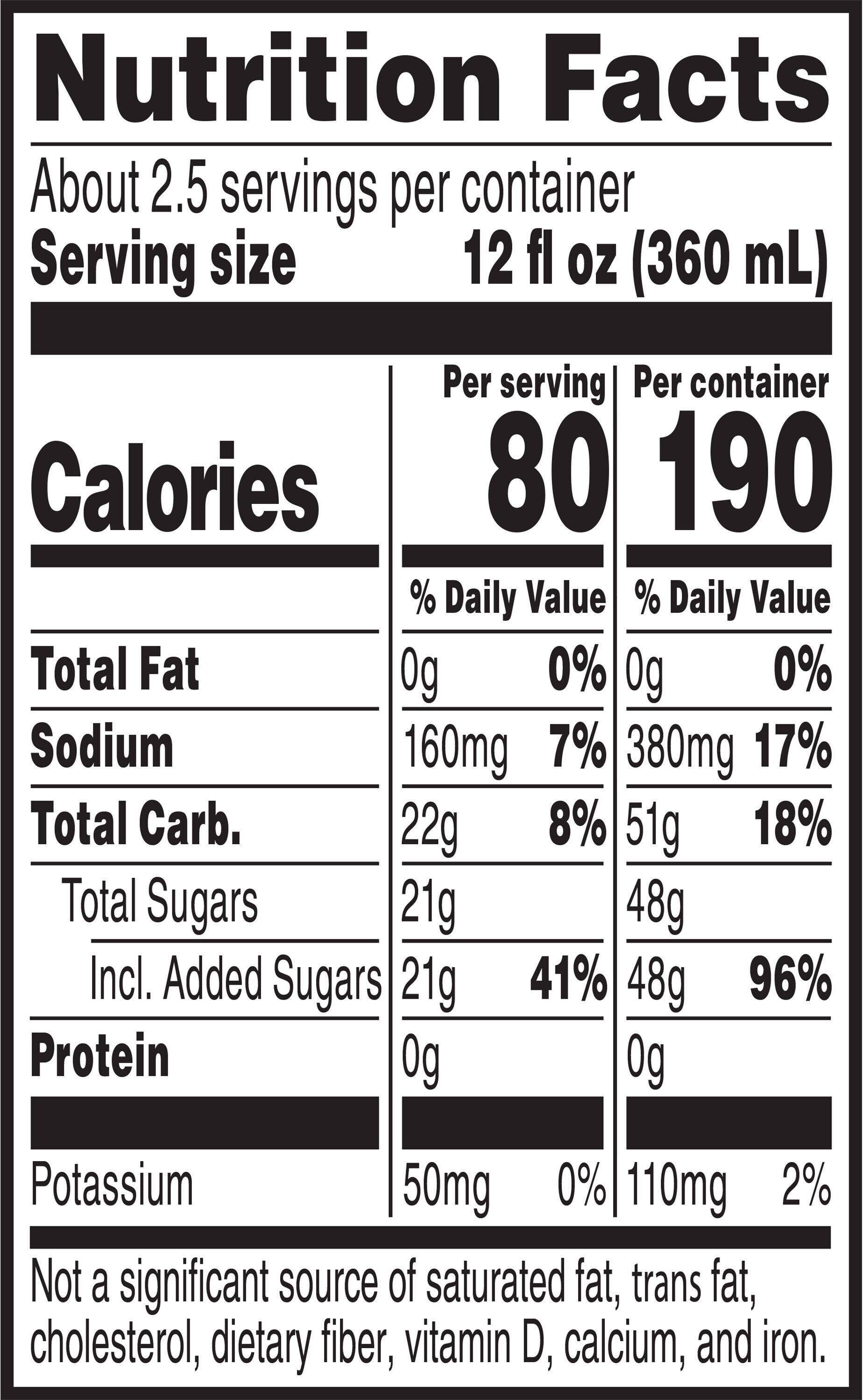 Ingredients: Water, sugar, dextrose, citric acid, salt, sodium citrate, monopotassium phosphate, gum arabic, natural flavor, sucrose acetate isobutyrate, glycerol ester of rosin, yellow 6.